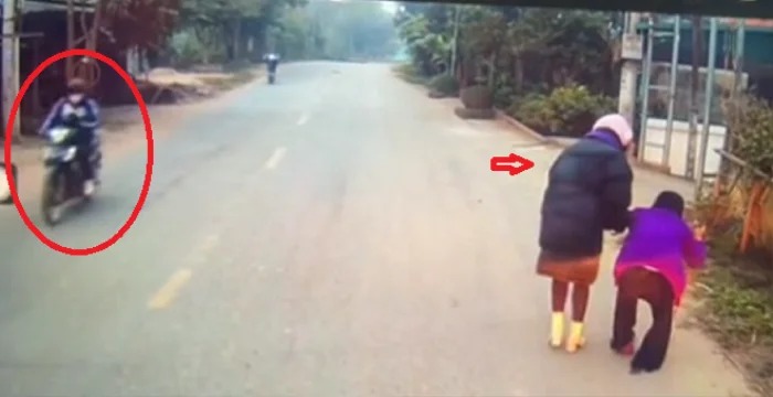Thấy vậy bác tài dừng xe lại từ xa để che chắn cho cụ chậm rãi đi sang đường. Nhưng sự tử tế chưa dừng lại ở đó, phía sau một người phụ nữ lái xe máy khi đi gần đến nơi thì phát hiện ra sự việc nên đã xuống xe rồi chạy đến dìu cụ bà qua đường.