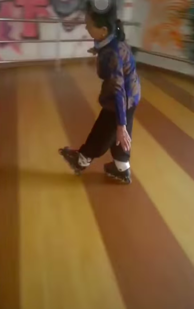 Theo đó, một cụ bà mặc quần đen, áo hoa tối màu đang di chuyển cực kì uyển chuyển và dẻo dai trên đôi giày patin. Trong lúc trượt, cụ bà còn thay đổi khá nhiều động tác khó mà có lẽ cả những bạn trẻ cũng khó lòng thực hiện được.
