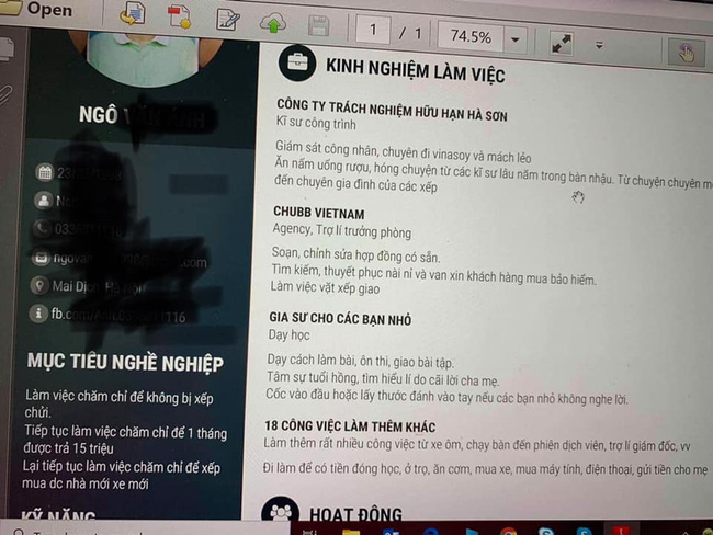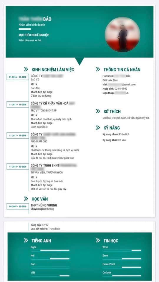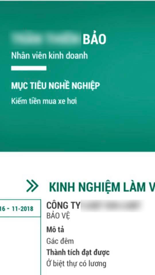 "Công việc đầu đời: Làm bảo vệ. Bạn có tin rằng với CV này của thằng em mình, nó được tuyển dụng không? Mới đầu nó làm kiểu chính chuyên lắm, đọc vô thấy khá là bài bản lắm, mà đợi quài không ai gọi, chắc do một màu quá không có gì đặc biệt. Cái nó sửa đi sửa lại, ghi kiểu đúng bản chất của nó luôn, ngắn gọn thế này thôi mà có người hốt."