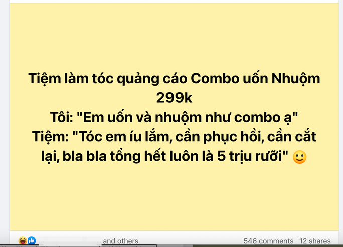 Xung quanh chuyện làm đẹp ngày cận Tết, nhiều người dùng mạng xã hội còn thi nhau "tố" các chủ salon tóc "treo đầu dê, bán thịt chó". Cụ thể, sau bài viết kể về "tình trạng chung" của nhiều tiệm tóc ngày cận Tết là quảng cáo "combo" uốn, nhuộm 299.000 đồng nhưng khi khách hàng chọn "combo" này thì chủ salon lại tặc lưỡi: "Tóc em xơ quá, phải phục hồi thêm, tổng là 5 triệu nha".