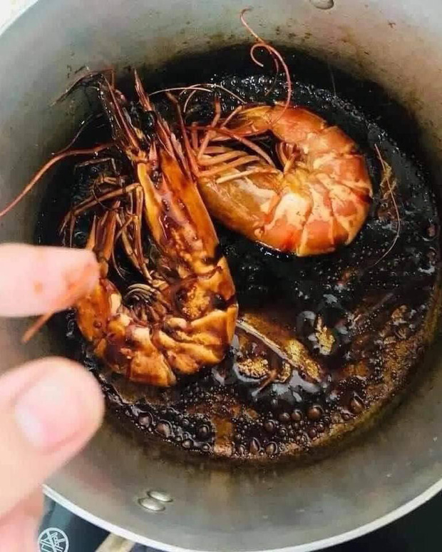 Không phải nấu cháy đâu, đây là dụng ý của món "tôm bán thân bất toại", một nửa chín ngon còn một nửa ngập trong lửa cháy.
