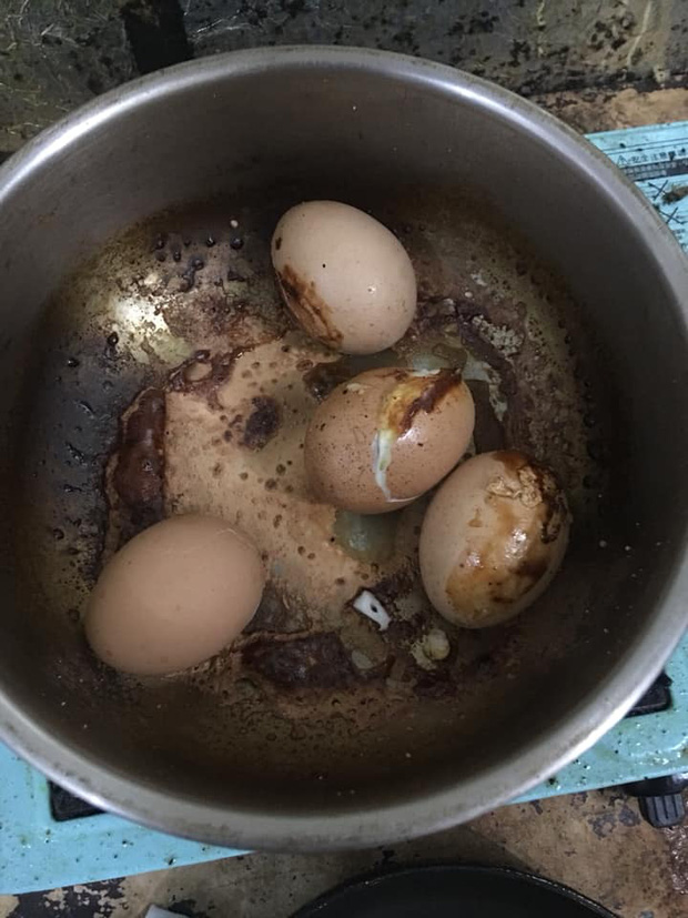 Trứng luộc chẳng may cạn nước, nhanh trí làm luôn thành trứng nướng.