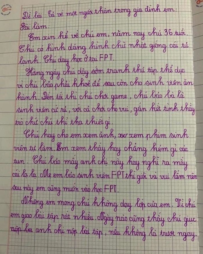 Dù yêu thích trường đó nhưng cậu bé không mong sau này chú sẽ trực tiếp dạy mình. “Vì chú em giao bài tập rất nhiều. Ngày nào cũng thấy chú giục các anh chị nộp bài tập, nếu không học là trượt môn ngay”, em nhỏ này viết.