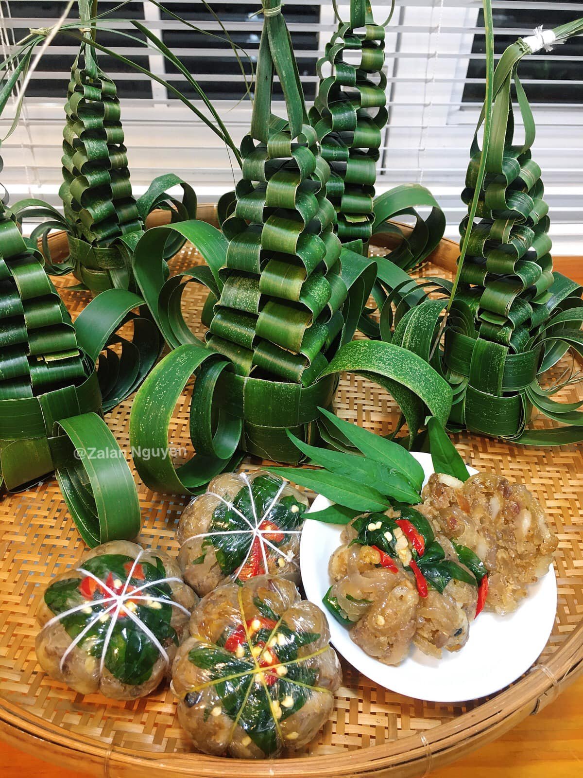 Sau khi chuẩn bị xong nem, bà con địa phương bắt đầu công đoạn trang trí. Người ta dùng lá dừa, đan, bện thành chiếc lầu (tháp) có nhiều tầng, lớp, nhỏ dần về phía trên.