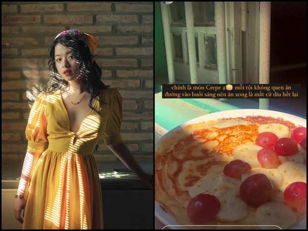 Ái nữ của diễn viên Chiều Xuân - Hồng Khanh thì tự tay chuẩn bị một phần bánh crepe ngon tuyệt, có chuối và nho không chỉ đẹp mà lại còn healthy.