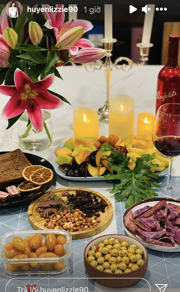 Huyền Lizzie cũng "chốt" lại buổi tối bằng một màn set up ăn vặt - uống rượu vang sang chảnh, không thua kém gì ở nhà hàng ngay tại nhà mình.