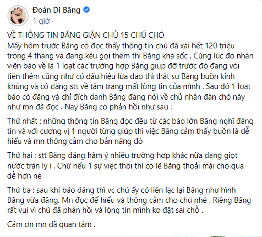 "Thứ nhất: Những thông tin Băng đọc đều từ các báo lớn, Băng nghĩ đáng tin và với cương vị một người từng giúp thì việc Băng cảm thấy buồn là dễ hiểu. (Mong) mọi người thông cảm cho bản năng đó.