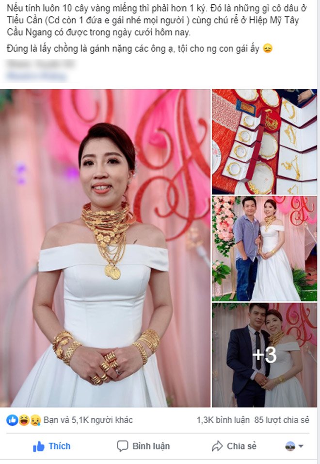Kèm theo những hình ảnh đó là bài chia sẻ: “Nếu tính luôn 10 cây vàng miếng thì phải hơn một ký vàng. Đó là những gì cô dâu ở Tiểu Cần cùng chú rể ở Hiệp Mỹ Tây có được trong ngày cưới hôm nay. Đúng là lấy chồng là gánh nặng, tội cho người con gái ấy”.