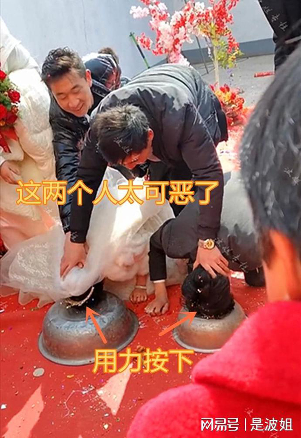 Về phía cô dâu, cô đã chủ động dập đầu xuống châụ thiếc, mặc dù lực không mạnh như chú rể nhưng tiếng vang vẫn rõ ràng. Thế nhưng, hai người họ hàng bên cạnh vẫn tỏ thái độ không hài lòng, cho rằng cái dập đầu này không đủ thành ý. Ngay sau đó, họ đã trực tiếp ấn đầu cô dâu chú rể xuống chậu một lần nữa.