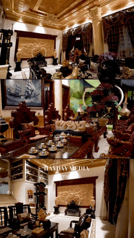 Bên trong không gian nội thất, chú rể Tiến Công xuất hiện trong bộ trang phục bảnh bao, bước ra từ gian phòng rộng lớn lấp lánh ánh đèn pha lê. Những món nội thất gỗ quý như sập gụ, tủ chè, bàn ghế khảm trai... được bày trí tinh xảo khiến dân tình không ngớt lời trầm trồ. Đèn chùm pha lê rủ xuống từ trần cao vút, bên cạnh là các vật phẩm trang trí được cho là làm từ ngọc quý, tạo nên không gian sống chuẩn vương giả hiếm thấy.