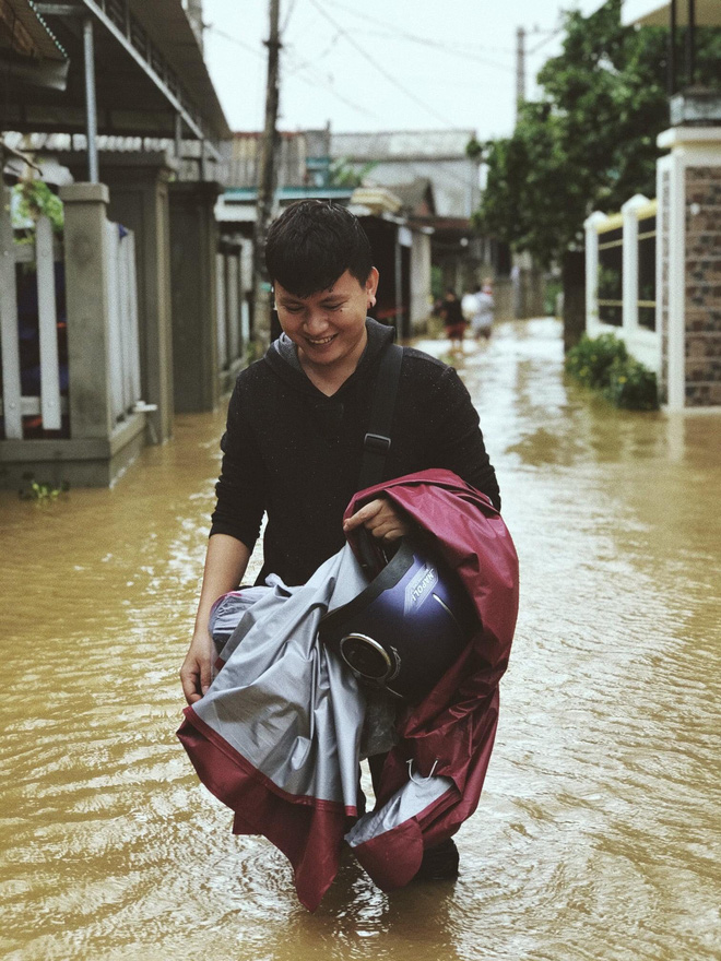 Dưới nước lũ, trên mưa gió, mình phải xắn quần cao, bảo vệ máy ảnh để chụp hình. Nhưng vẫn vui vì không khí cực rộn ràng, trong cái khó mọi người vẫn lạc quan. Dù chưa trọn vẹn nhưng mình tin hai bạn hạnh phúc nhất trong ngày hôm đó."