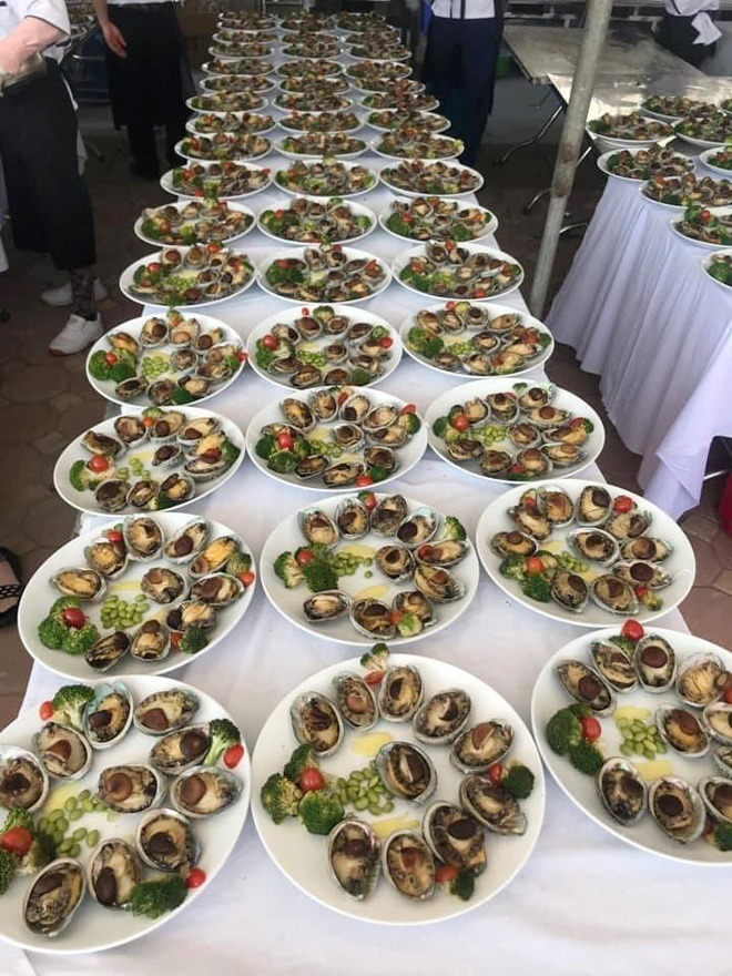 Nhắc đến thực đơn trong đám cưới "siêu khủng” này, người đàn ông cho biết, đám cưới tiếp đón khoảng 1500 quan khách với 150 mâm cỗ, trị giá 20.000.000 đồng/mâm, gồm: các món ăn như bào ngư sốt xì dầu, cua hoàng đế hấp, cá hồi áp chảo, trâu chao vừng, gà hấp lá chanh, xôi lệ mật,.... Đây đều là món ăn sang trọng, ít xuất hiện trong mâm cỗ của người Việt.