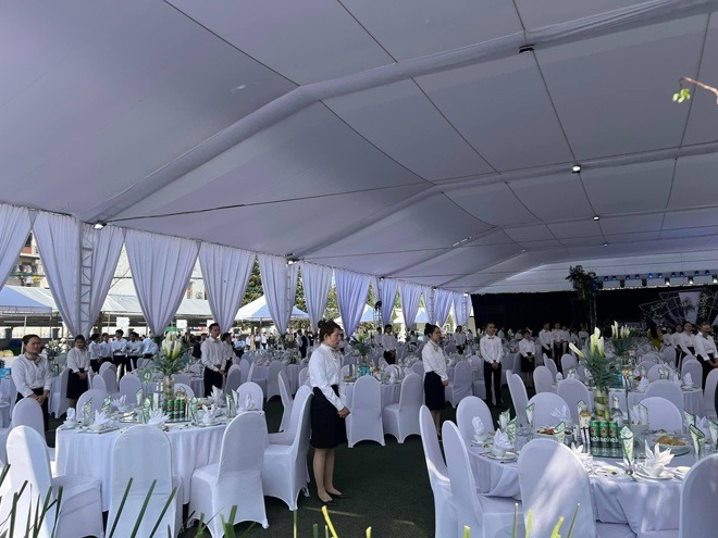 Và một điểm ấn tượng làm nên độ hoành tráng của đám cưới này đó là mỗi bàn tiệc có ít nhất 1 nhân viên phục vụ quan khách. Ngoài ra có 50 nhân viên hậu cần chạy trong phía nhà bếp.