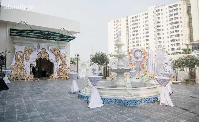 Ngay ngoài sảnh trung tâm tiệc cưới là chiếc xe cổ mang biển số "chiếc xe tình yêu" dùng để đưa cô dâu vào sân khấu.
