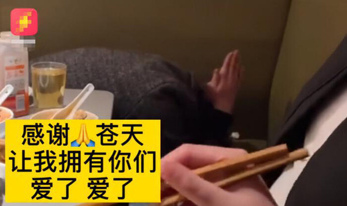 Sau đó, cô gái liền chắp tay lạy lục như vừa muốn cảm ơn sự nhiệt tình của nhà hàng, vừa như muốn ra hiệu cho chúng bạn hãy buông tha đừng trêu chọc cô nữa.