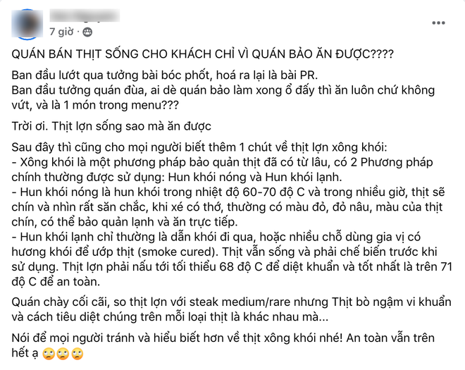 Đặc biệt, một cư dân mạng còn đưa ra những phần giải thích chi tiết về các món thịt hun khói, nhấn mạnh rằng loại thịt trong món bánh mì trên là chưa chín, không an toàn khi ăn (phải được làm chín thì mới ăn được).