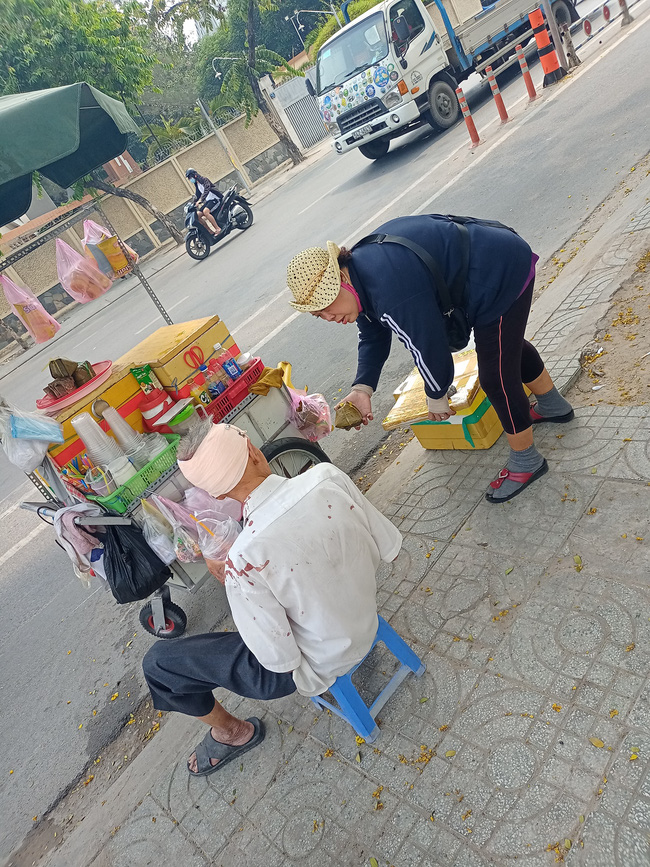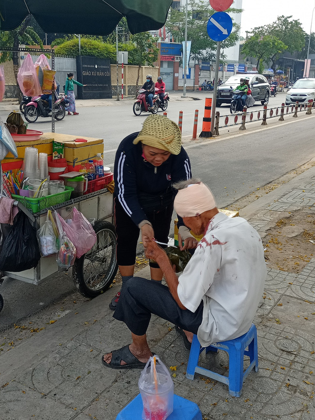 "Hôm nay mình đứng ở cổng bệnh viện 175 đợi bạn thì thấy cảnh này. Ông bị tai nạn chấn thương đầu, đang ngồi nghỉ ở quầy nước cô này. Cô cho ông 1 ly nước rồi ngồi hỏi chuyện. Rồi hỏi ông đói không. Cô lấy mấy cái bánh giò nóng hổi cho ông ăn. Còn rửa tay, lau tay cho ông. Nhìn mà thương.