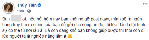 Chính vì thế, mọi người đang vô cùng phẫn nộ hành động lừa đảo này và hi vọng mọi người nên cẩn thận trước những kẻ kêu gọi mạo danh. Hiện tại tài khoản này đã ẩn ngay sau khi bị nhiều người phát hiện. Đích thân nữ ca sĩ sau đó phải lên án và dọa sẽ nhờ đến sự can thiệp của pháp luật nếu tài khoản trên không ngưng hành động lợi dụng lòng tin và hoàn cảnh khó khăn của đồng bào để trục lợi.
