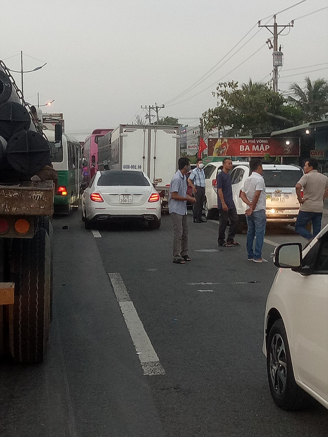 Xe ô tô phải nhích từng chút một trên các đường Quốc lộ, nhiều người cập nhật tình hình cho biết vì tắc đường quá lâu nên các bác tài đã xuống xe để... trò chuyện, hóng mát.