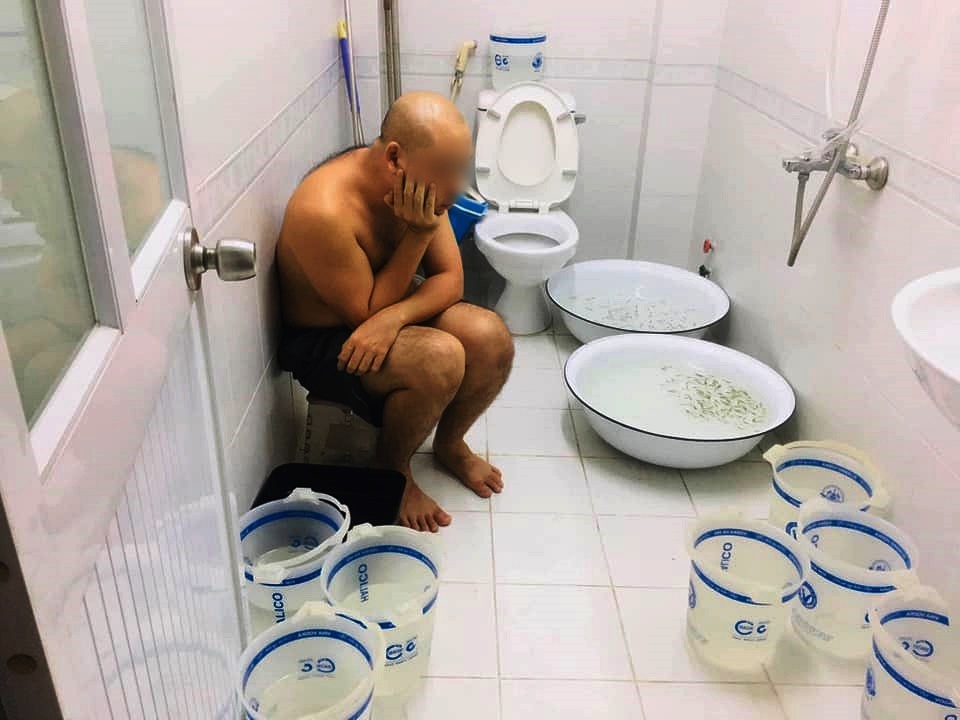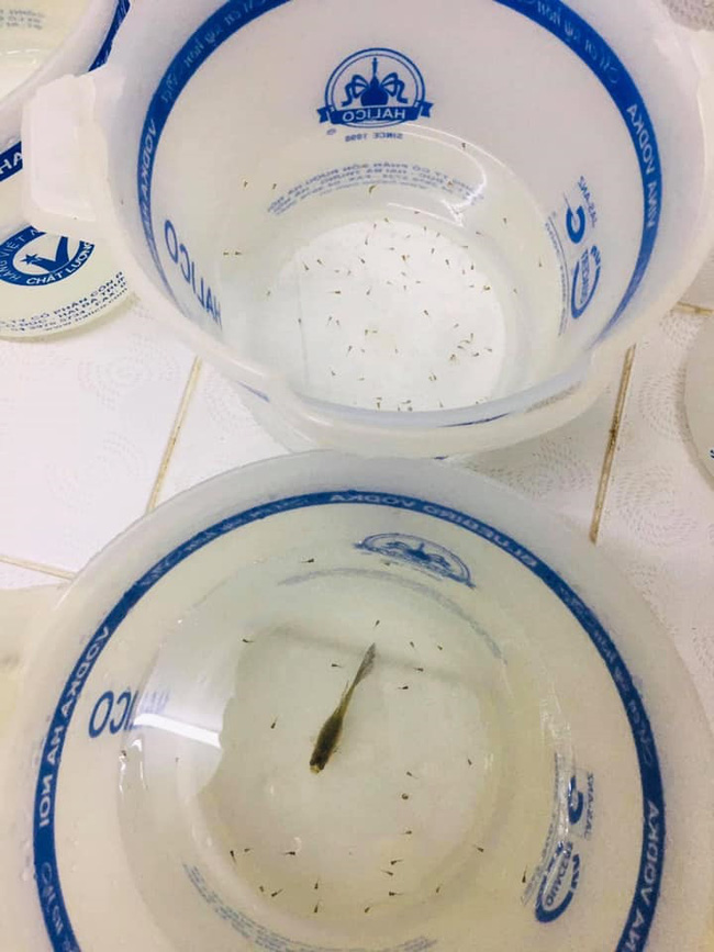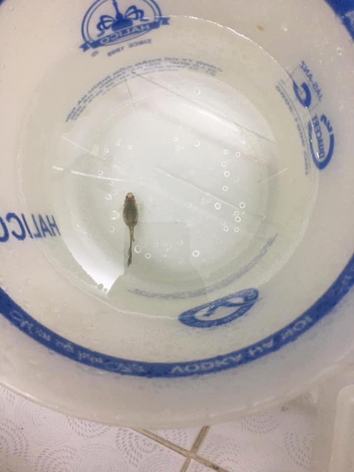 Nhìn anh chàng ngồi thẫn thờ trước đống xô chậu, ai cũng tò mò không hiểu chàng trai ấy đang làm gì giữa đêm hôm. Tuy nhiên khi nhìn kỹ chiếc xô mà anh chàng chụp lại, trong đó có một chú cá nhỏ, mọi người mới phát hiện ra đàn cá con li ti đang bơi, vừa chào đời từ bụng cá mẹ.