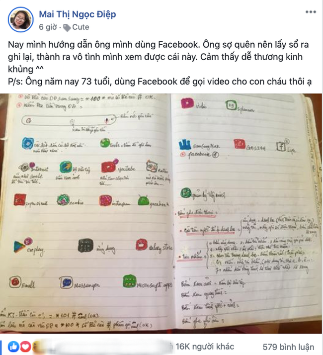 Mới đây, tài khoản Mai Thị Ngọc Điệp đã chia sẻ câu chuyện ông dùng Facebook vô cùng dễ thương, nhất là mà ông dùng để ghi nhớ tính năng sử dụng mới khiến nhiều bạn trẻ trầm trồ xen lẫn thích thú.