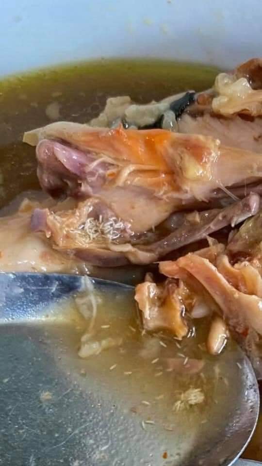 "Gà hầm có dòi, ghê quá mọi người ơi. Lúc đầu ham nói chuyện với bạn nên có ăn 1 ít, sau nhìn lại cái gì lúc nhúc trắng trắng nhận ra thì giật bắn mình, chạy ra ngoài nôn thốc nôn tháo ra.
