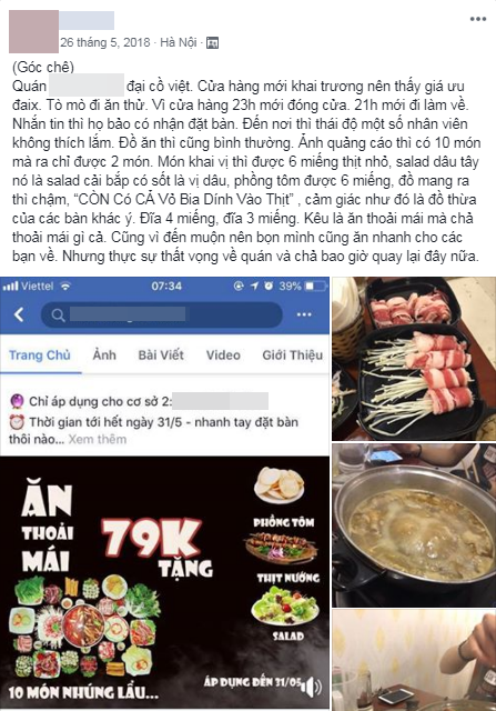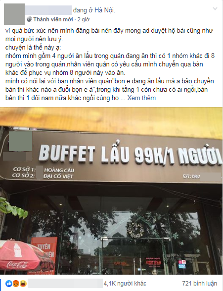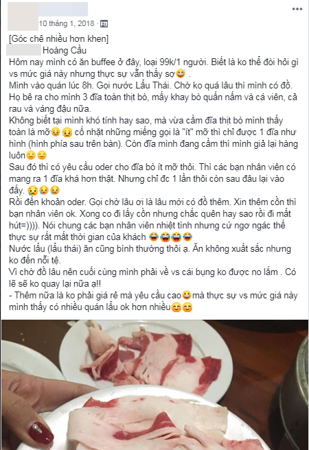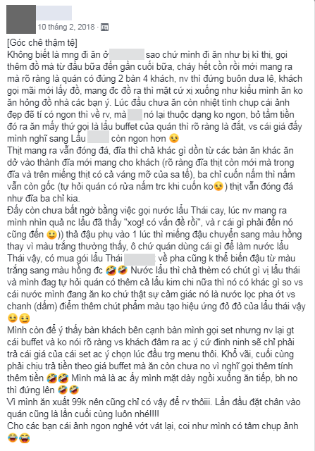 Mặc dù không muốn gây ồn ào chú ý, nhưng vì quá tức giận với cách hành xử của quán lẩu buffet 99k nên chàng trai tên X.T đã phải viết bài chia sẻ nhằm cảnh báo mọi người. Ngay khi vừa đăng lên một hội nhóm dành cho những người đam mê ẩm thực, trải nghiệm tệ hại của X.T đã khiến hàng nghìn thành viên mạng quan tâm.