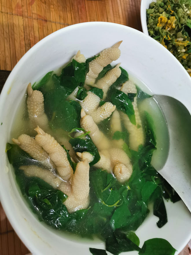 Nhìn qua màu sắc của bát canh có vẻ khá ổn, thế nhưng topping của món canh rau ngót này lại là 4 - 5 chiếc chân gà nguyên móng nhọn. Thông thường, khi ăn phần đầu móng của chân gà nên được loại bỏ để an toàn hơn, đồng thời đảm bảo tính thẩm mỹ. Chỉ một điểm nhỏ như vậy thôi đã đủ khiến bát canh từ món ngon thành món khó nói rồi.