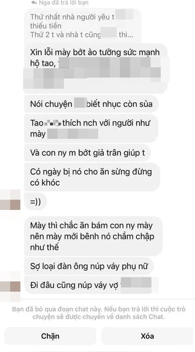 "Xin lỗi mày bớt ảo tưởng sức mạnh. Tao không thích nói chuyện với người như mày. Người yêu mày bớt giả trân giùm tao. Có ngày bị nó cho 'ăn sừng' đừng có khóc. Mày chắc ăn bám người yêu mày nên mày mới bênh nó chằm chặp như thế. Sợ loại đàn ông núp váy phụ nữ. Đi đâu cũng núp váy vợ".