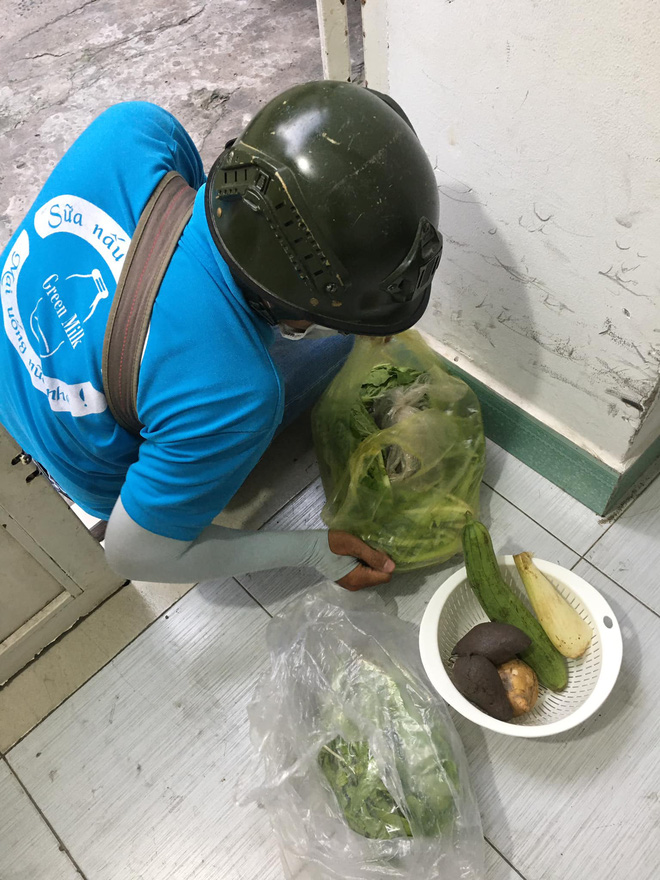 Nhưng mình chỉ lấy đủ thôi để lại cho anh còn ăn nữa. Anh xua tay nói anh có đủ rồi, anh đem chia cho em với mấy bạn khác đó. Đây là rau củ anh được mấy cô chú hàng xóm thương cho. Anh thấy đủ ăn rồi nên đem đi cho ai cần hơn.