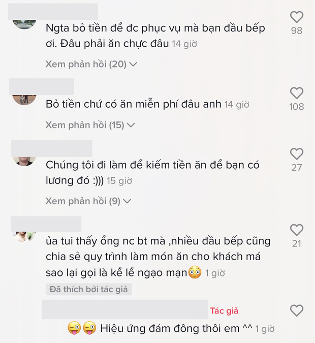 - "Người ta bỏ tiền ra để được phục vụ mà các bạn đầu bếp ơi, đâu phải ăn chực đâu!"