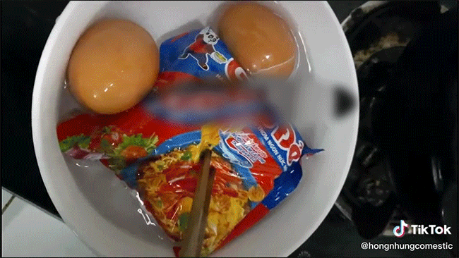 Cụ thể, người này hướng dẫn mọi người cho cả gói mì, bao gồm cả vỏ nilon vào nồi nước sôi sùng sục để nấu lên cùng với trứng nguyên quả. Sau khi nấu xong như vậy thì bỏ ra, bóc vỏ và làm y như cách quen thuộc. Điều đáng nói là lại dùng chính nước luộc cả vỏ mì để chế vào bát mì.