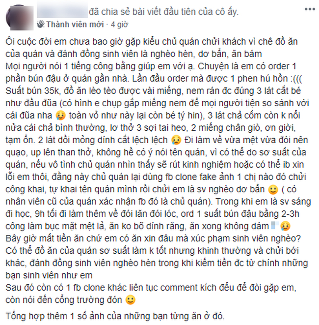 23/10/2020 06:54Đăng đàn bóc phốt quán bún đậu 'treo đầu dê bán thịt chó', nữ sinh viên bị chủ quán chửi là 'đồ nghèo hèn, dơ bẩn, ăn bám'
