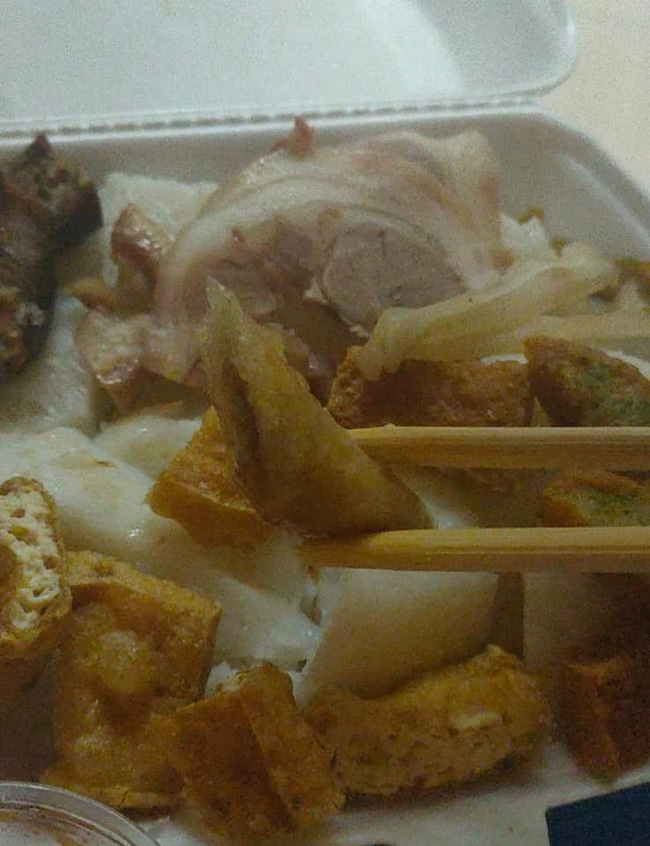 Bên trong hộp đồ ăn chỉ có lèo tèo vài miếng: Chả cốm được đúng 3 lát còn không nổi một nửa cái chả, nem rán thì được 3 lát cắt bé như đầu đũa, 2 miếng chân giò, 2 lát dồi mỏng như tờ giấy cùng lơ thơ 3 sợ tai heo chẳng khác nào sợi chỉ.