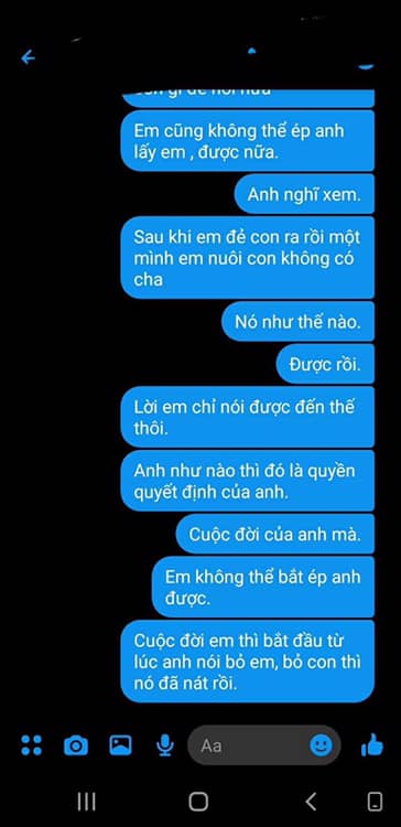"Em cũng không thể ép anh lấy em được nữa, anh nghĩ xem. Sau khi em đẻ con ra rồi một mình em nuôi con không có cha, nó như thế nào. Được rồi, lời em chỉ nói được đến thế thôi, anh như nào thì đó là quyền quyết định của anh. Cuộc đời của anh mà, em không thể bắt ép anh được. Cuộc đời em thì bắt đầu từ lúc anh nói bỏ em, bỏ con thì nó đã nát rồi".