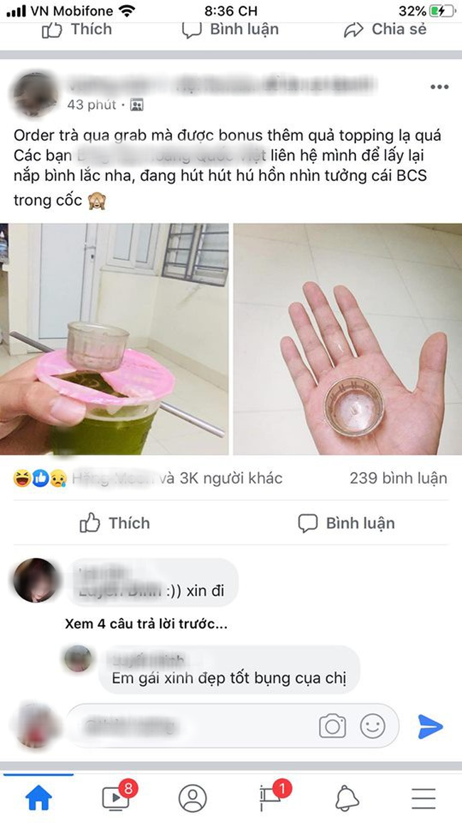 ''Order trà sữa qua ứng dụng của Grab mà được bonus thêm quả topping lạ quá. Các bạn *** liên hệ mình để lấy lại nắp bình lắc nha, đang hút thì hú hồn tưởng cái bao cao su trong cốc''.