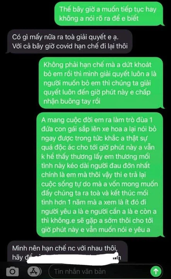 “Anh mang cuộc đời em ra làm trò đùa, 1 đứa con gái sắp lên xe hoa anh lại nói bỏ ngay được trong tức khắc. Anh thật sự quá độc ác, cho tới giờ phút này anh vẫn không hề thấy thương em, thương mối tình kèo dài này, người đau đớn vẫn là em mà thôi… Cho tới giờ phút này em vẫn muốn nói em yêu anh”.