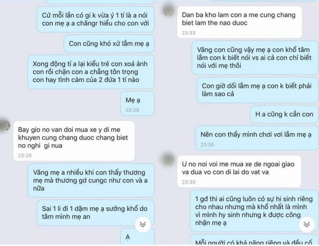 Cô con dâu sau đó cũng đi tâm sự với mẹ chồng. Cô nói rằng chồng mình trẻ con, động tí là xóa ảnh, chặn vợ mình mà không hề tôn trọng ý kiến hay tình cảm của cả hai. Người mẹ chồng tỏ vẻ bất lực với con trai mình và hiểu rõ việc làm từ đầu đến cuối của anh ta.