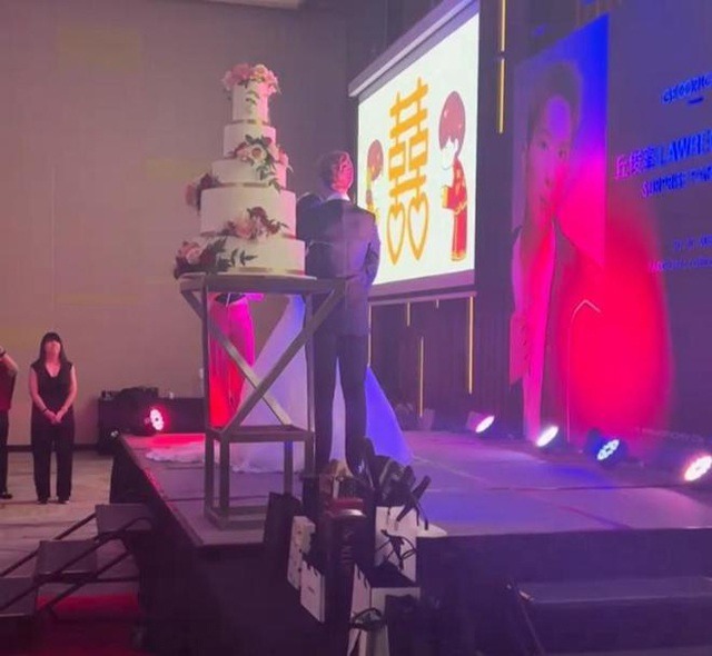 Sự việc này vừa xảy ra cách đây không lâu tại Đài Loan. Theo video được ghi lại bởi một quan khách có mặt, đám cưới được tổ chức trong một khách sạn khá sang trọng và hoành tráng. Phía dưới, rất đông khách mời đang vừa ngồi ăn tiệc, vừa theo dõi hôn lễ. Bên trên sân khấu, cô dâu chú rể đang mặc lễ phục, chuẩn bị tiến hành các nghi lễ đám cưới.