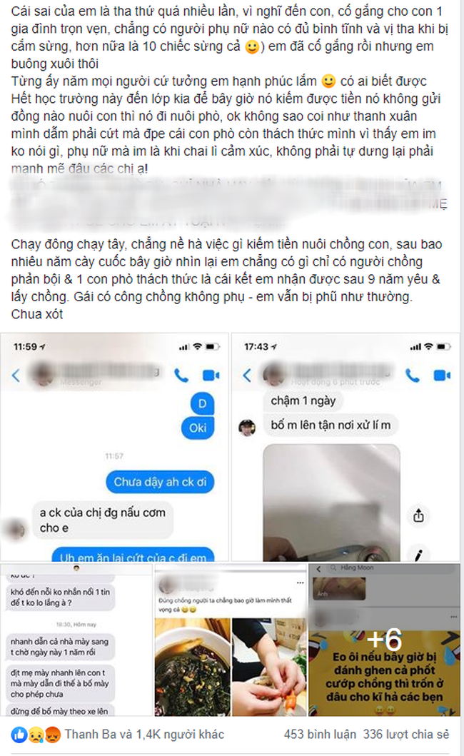 Cuối cùng, người vợ cay đắng viết: "Cái sai của mình là đã tha thứ quá nhiều. Chạy đông chạy tây, chẳng nề hà việc gì kiếm tiền nuôi chồng con, sau bao nhiêu năm cày cuốc bây giờ nhìn lại mình chẳng có gì chỉ có người chồng phản bội và bị nhân tình của chồng thách thức sau 9 năm yêu và lấy chồng. Gái có công chồng không phụ - em vẫn bị phũ như thường. Chua xót!".