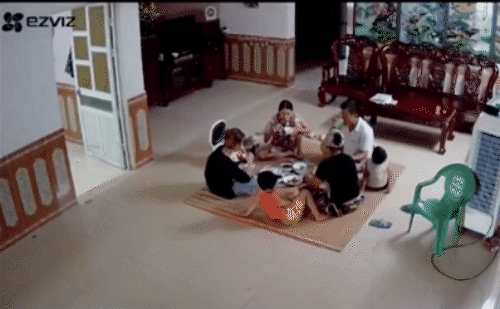 Trong video, có thể thấy cảnh một gia đình đang ngồi quây quần ăn cơm giữa nhà, 6 người già trẻ lớn bé đều đủ cả. Chỉ vài giây sau, một cánh quạt trần từ phía trên rơi xuống với tốc độ trời giáng, tạo nên một tiếng động rõ to.