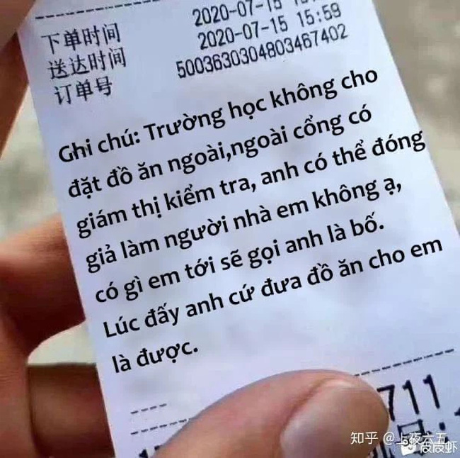 Cụ thể, học sinh này nhắn nhủ shipper: "Trường học không cho đặt đồ ăn ngoài. Ngoài cổng có giám thị kiểm tra, anh có thể đóng giả làm người nhà em không ạ. Có gì em tới sẽ gọi anh là bố. Lúc đấy anh cứ đưa đồ ăn cho em là được".