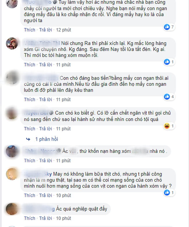 "Đây là lần cắt thứ 2, mẹ em thấy hỏi thì bảo là ''chó nhà cô à?''. Gọi công an người ta cũng chỉ giải quyết theo kiểu hàng xóm thì bỏ qua cho nhau. Em hỏi các bác xem có mấy con ngan đáng bao nhiêu tiền mà bố con nó hành hạ con cho nhà em như vậy?''.