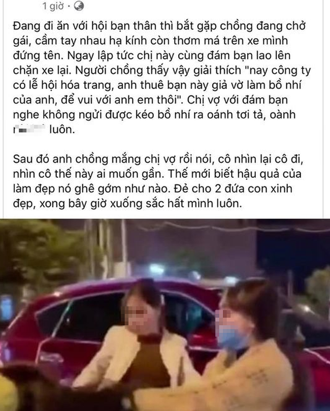 Bài đăng có nội dung như sau: "Đang đi ăn với hội bạn thân thì bắt gặp chồng đang chở gái, cầm tay nhau hạ kính còn thơm má trên xe mình đứng tim. Ngay chị này cùng đám bạn lao lên chặn xe lại. Người chồng thấy vậy giải thích: 'Nay công ty có lễ hội hóa trang. Anh thuê bạn này giả vờ làm bồ nhí của anh, để vui với anh em thôi. Chị vợ với đám bạn nghe không ngửi được kéo bồ nhí ra đánh tơi tả.