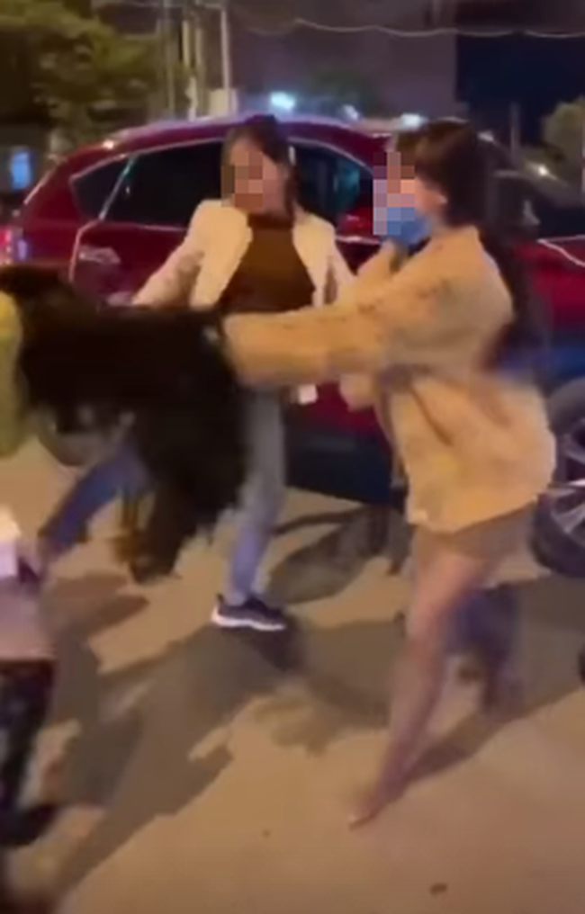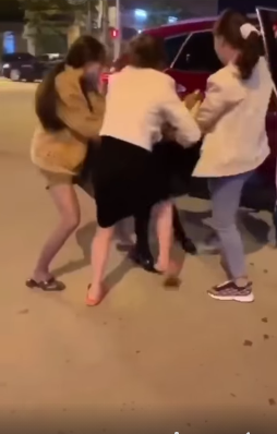 Khi cô gái trẻ vừa bước xuống xe lại xuất hiện thêm 1 người phụ nữ nữa lao vào đánh cùng. Cả 3 túm tóc tiểu tam tạ tới tấp. Phải 30 giây sau anh chồng mới xuống can ngăn: "Thôi. Chúng mày đi ra hết". Sau đó người đàn ông này cố gắng đẩy từng người phụ nữ đang xúm lấy tình nhân của mình nhưng chẳng cản nổi.