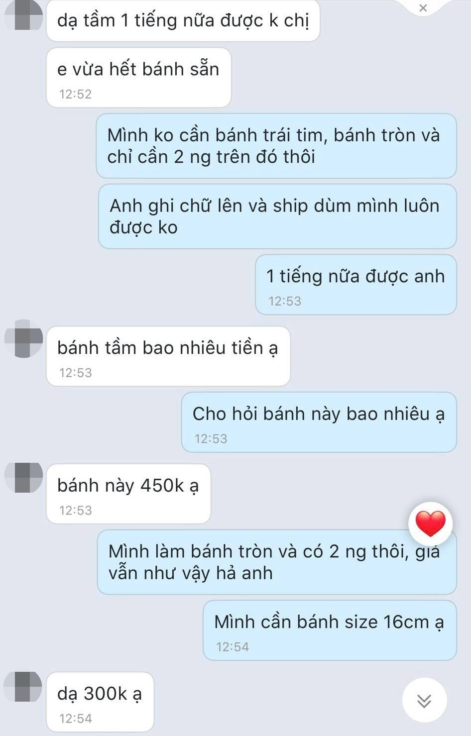 Trong tin nhắn đặt bánh của chị V.P, chị cho biết mình không cần bánh trái tim như minh họa mà có thể thay bằng hình tròn và chỉ cần 2 mặt người thôi là được. Tuy nhiên đến khi nàng dâu nhìn thấy chiếc bánh bố chồng nhận được thì không thốt nên lời. Không dừng lại ở đó, chị V.P còn cho biết mình đã phải chi đến 320k (cả ship) cho chiếc bánh này khiến nhiều người bất bình.