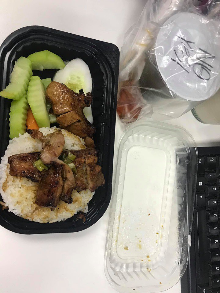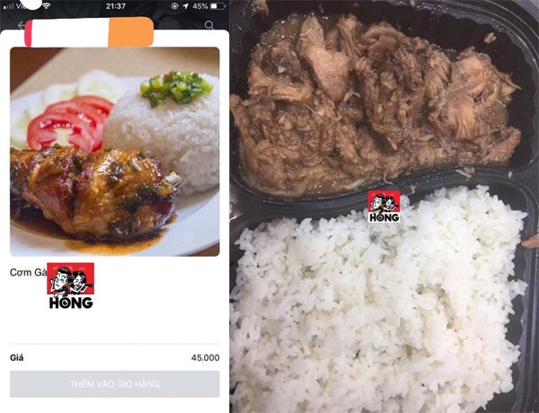 Cuối tháng 3, cũng có 1 cô gái đăng đàn kể khổ về trải nghiệm hài hước của mình khi đặt cơm trưa qua mạng. Cô gái trong bài đăng đã đặt một suất cơm gà với hình minh họa trông vô cùng hấp dẫn và ngon mắt với đầy đủ cả những món ăn kèm như cà chua, dưa leo có giá là 45 nghìn đồng.