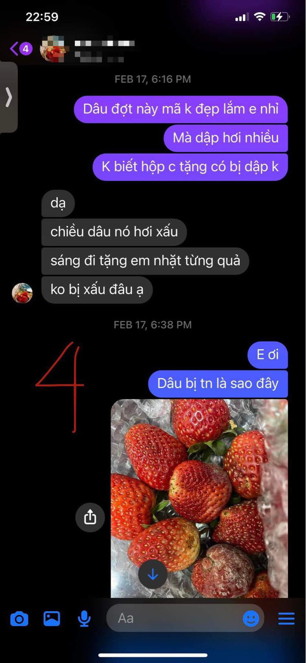 Thế nhưng khi nhận được sản phẩm, vị khách hàng mới tá hoả vì số dâu hỏng phân nửa. Hộp dâu tặng sếp cũng không khác biệt là bao, quả thì dập nát, quả lại mốc meo. Hơn thế, tấm thiệp nhờ shop viết hộ lại biến thành tờ hoá đơn với phần note cẩu thả.