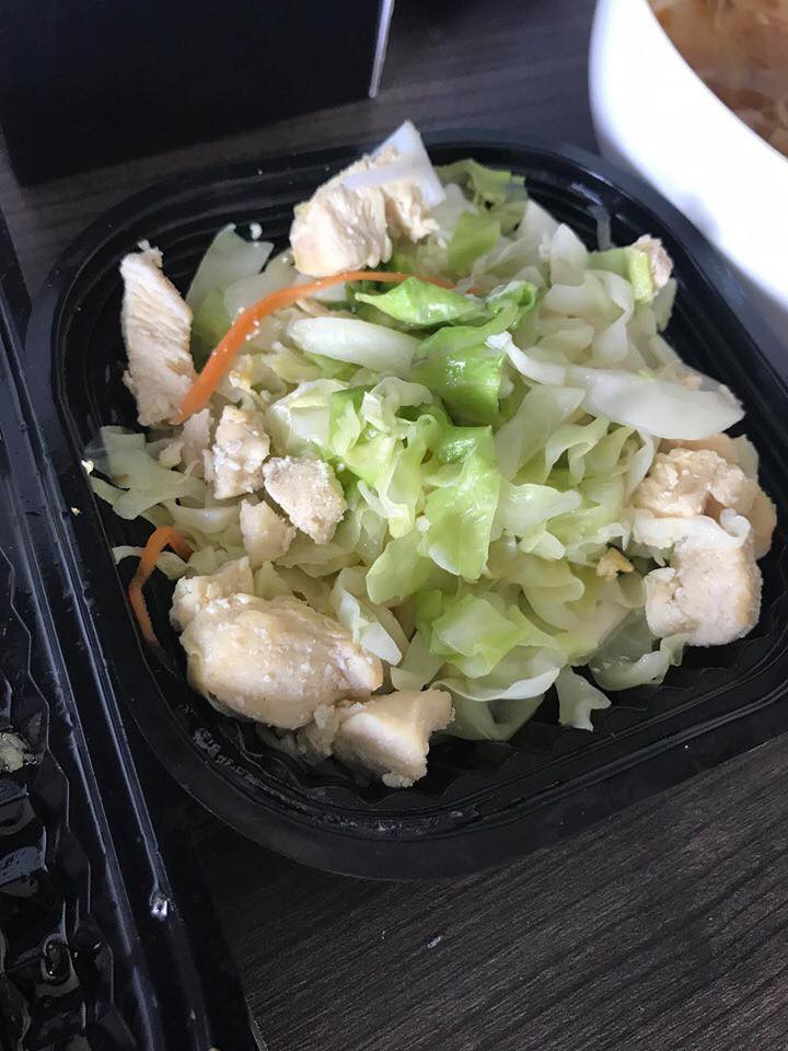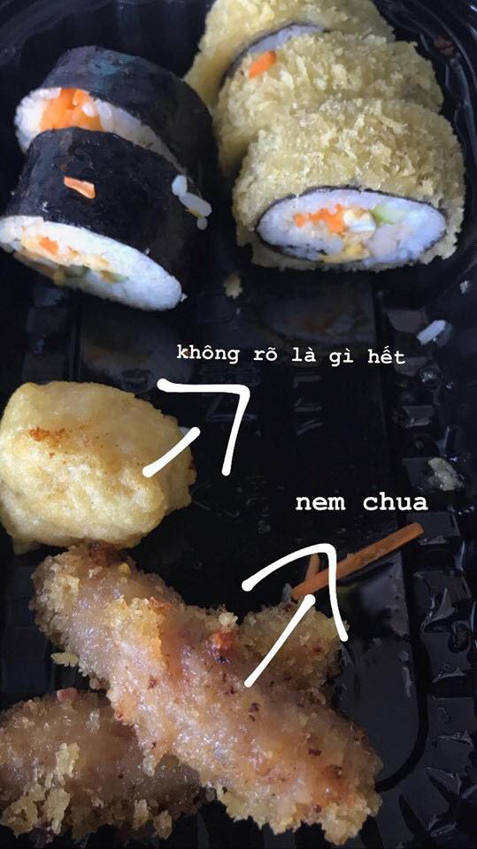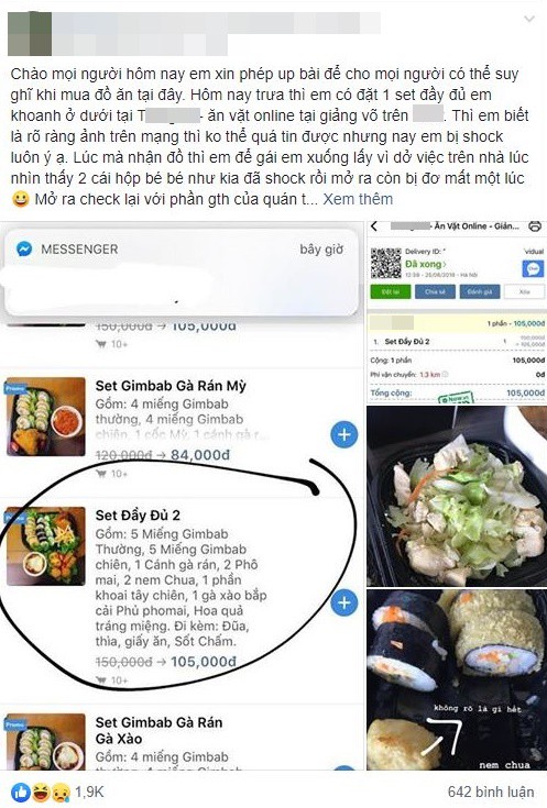 Tuy nhiên, khi nhận về thì cô nàng phát hiện bị thiếu mất 1 phần khoai tây chiên và không hề có hoa quả tráng miệng. Không những thế, đồ ăn còn không được như mong muốn vì: "Em ăn thì gà rán vẫn thấy hơi sống, phô mai thì không biết có phải 2 cục dưới ảnh không cơ ạ. Gimbab quấn lỏng vừa gắp thì rơi hết nhân ra".