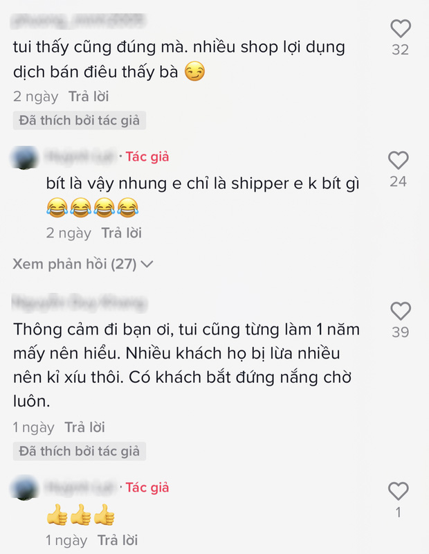 - Mình đặt hàng cũng chẳng bao giờ làm khó shipper vì mình biết các bạn ấy rất cực. Hàng bị thiếu hoặc hư hỏng thì nên làm việc với chủ shop mới phải.